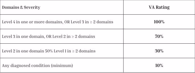 Each domain is rated from 0 (no impairment) to 4 (total impairment). Your overall rating—from 10% up to 100%—is determined by how many domains are affected and how severely.